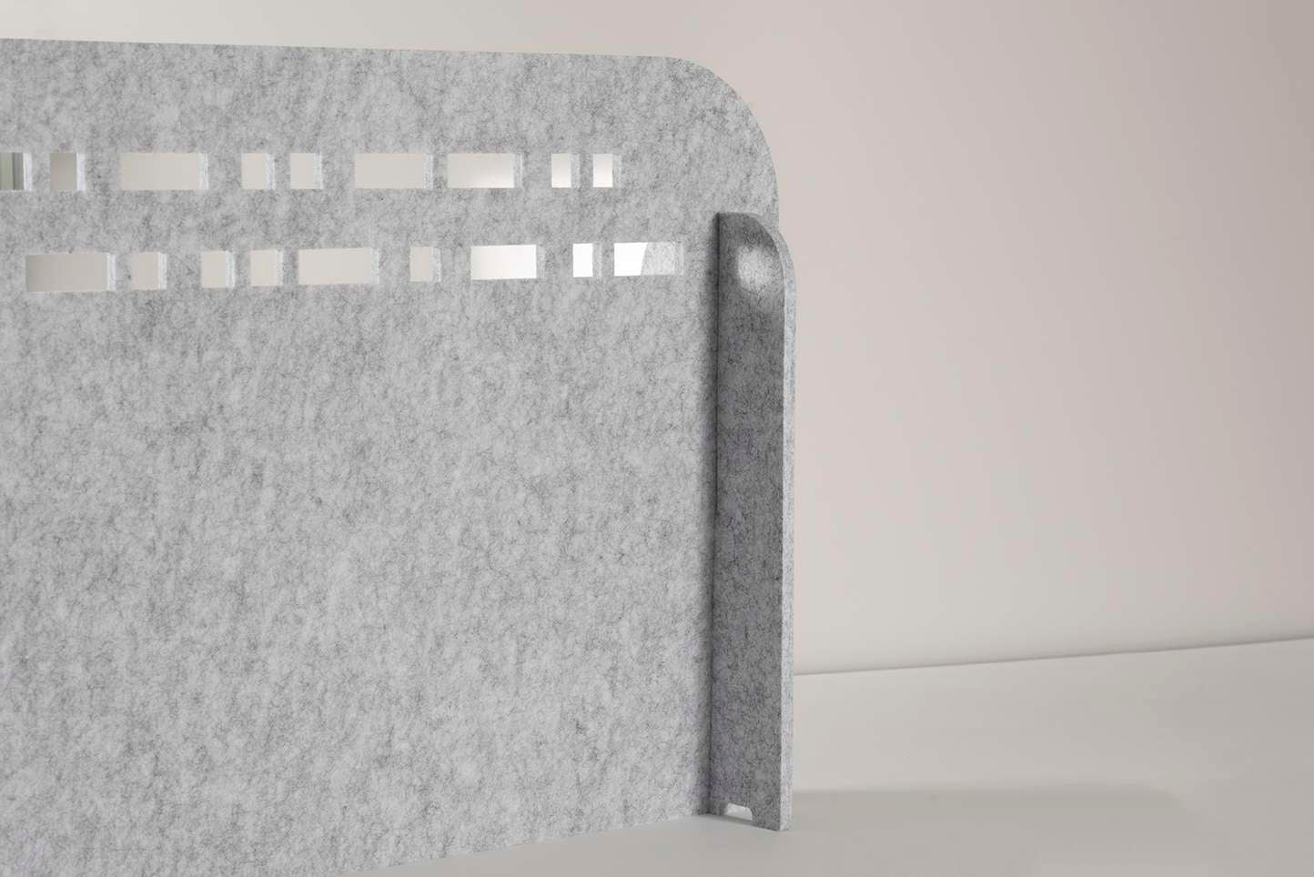 Met een dikte van 9 mm biedt dit Bureau Scheidingsscherm van PET-vilt uitstekende geluidsabsorptie. Daarnaast is aandacht besteed aan het ontwerp. Het gatenpatroon in de lange zijde biedt een subtiel doorkijkje, waardoor het open karakter van het kantoor deels behouden blijft.