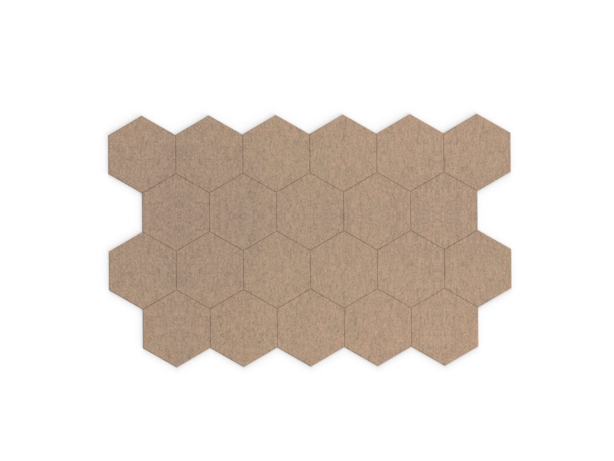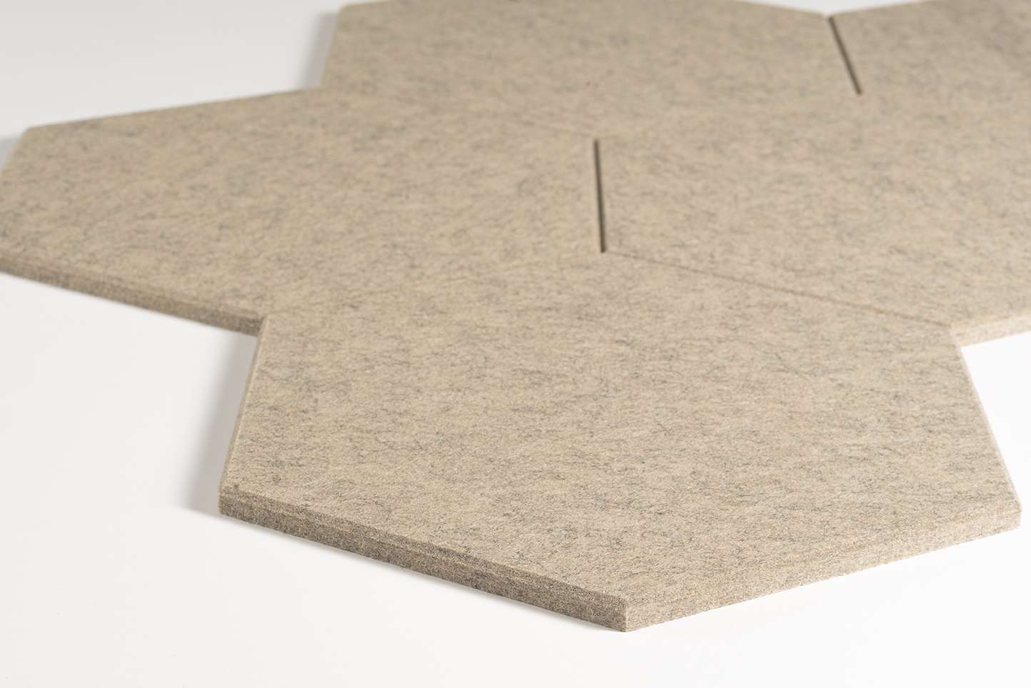 Akoestische wandbekleding bestaande uit 22 tegels in de vorm van een Hexagon. Het PET-vilt materiaal is gemaakt van gerecyclede PET-flessen en absorbeert hinderlijke nagalm en schelle geluiden. Daardoor ontstaat een fijne en rustige akoestiek in de ruimte.