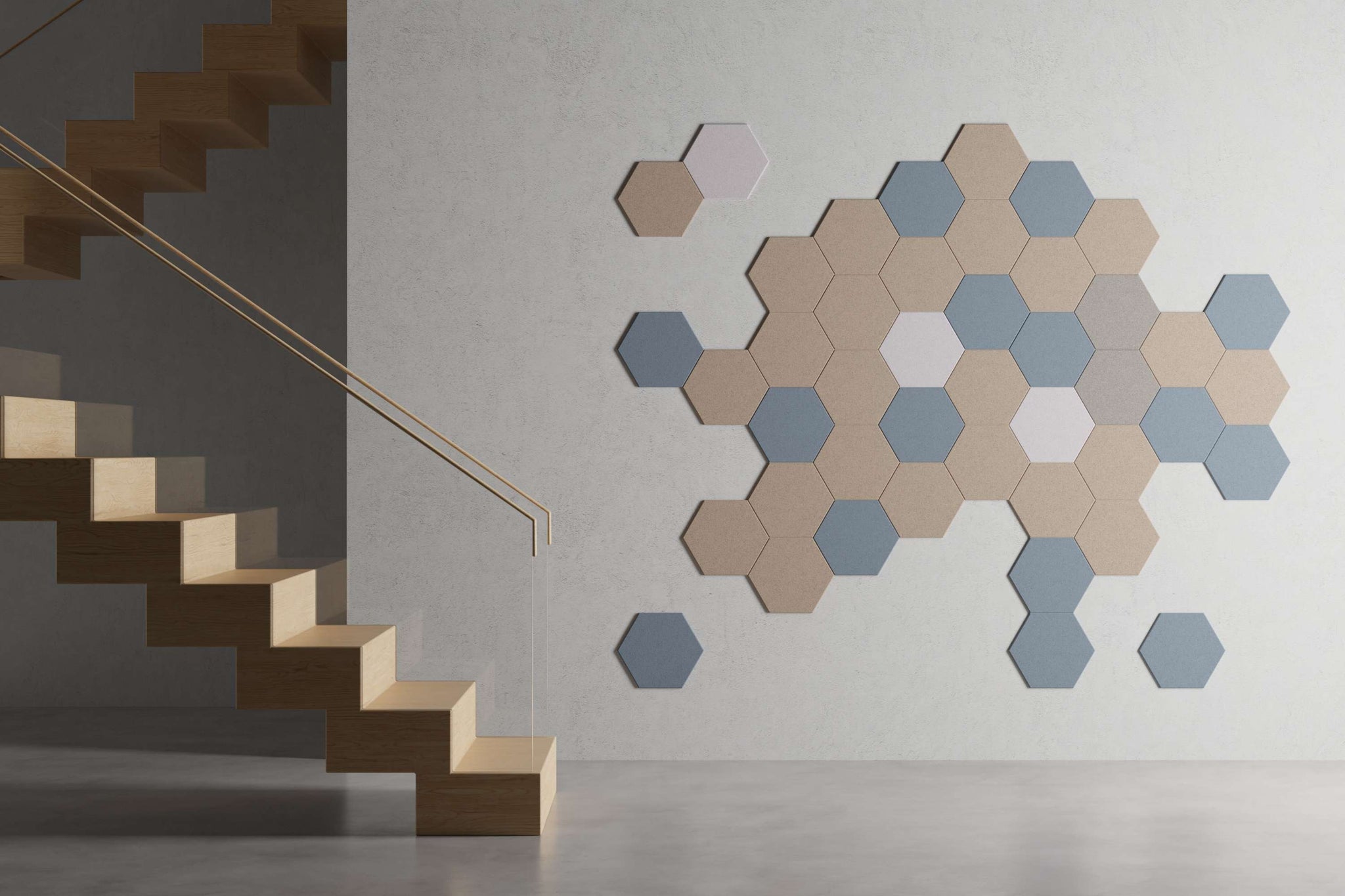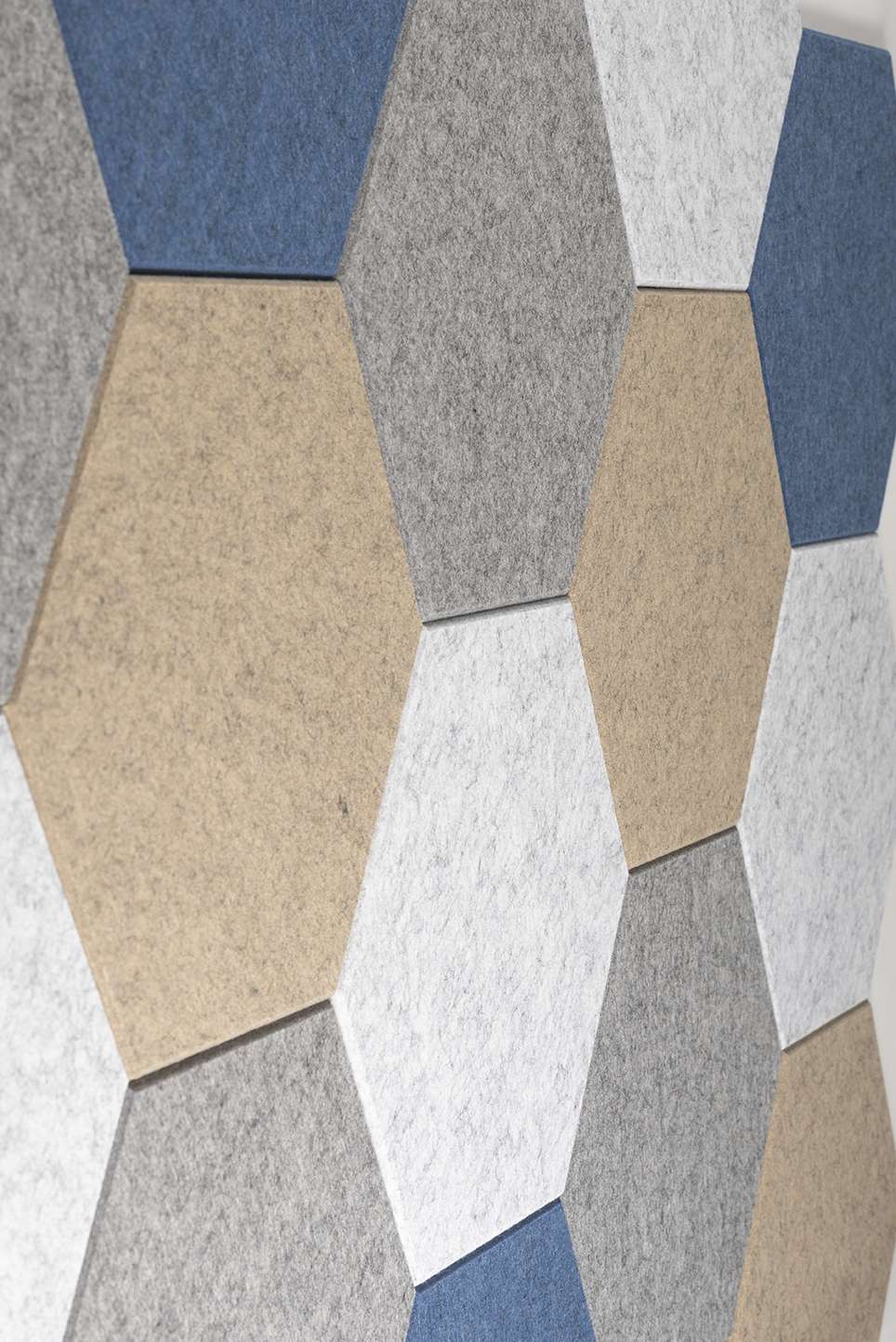 Akoestische wandbekleding bestaande uit 22 tegels in de vorm van een Hexagon. Het PET-vilt materiaal is gemaakt van gerecyclede PET-flessen en absorbeert hinderlijke nagalm en schelle geluiden. Daardoor ontstaat een fijne en rustige akoestiek in de ruimte.