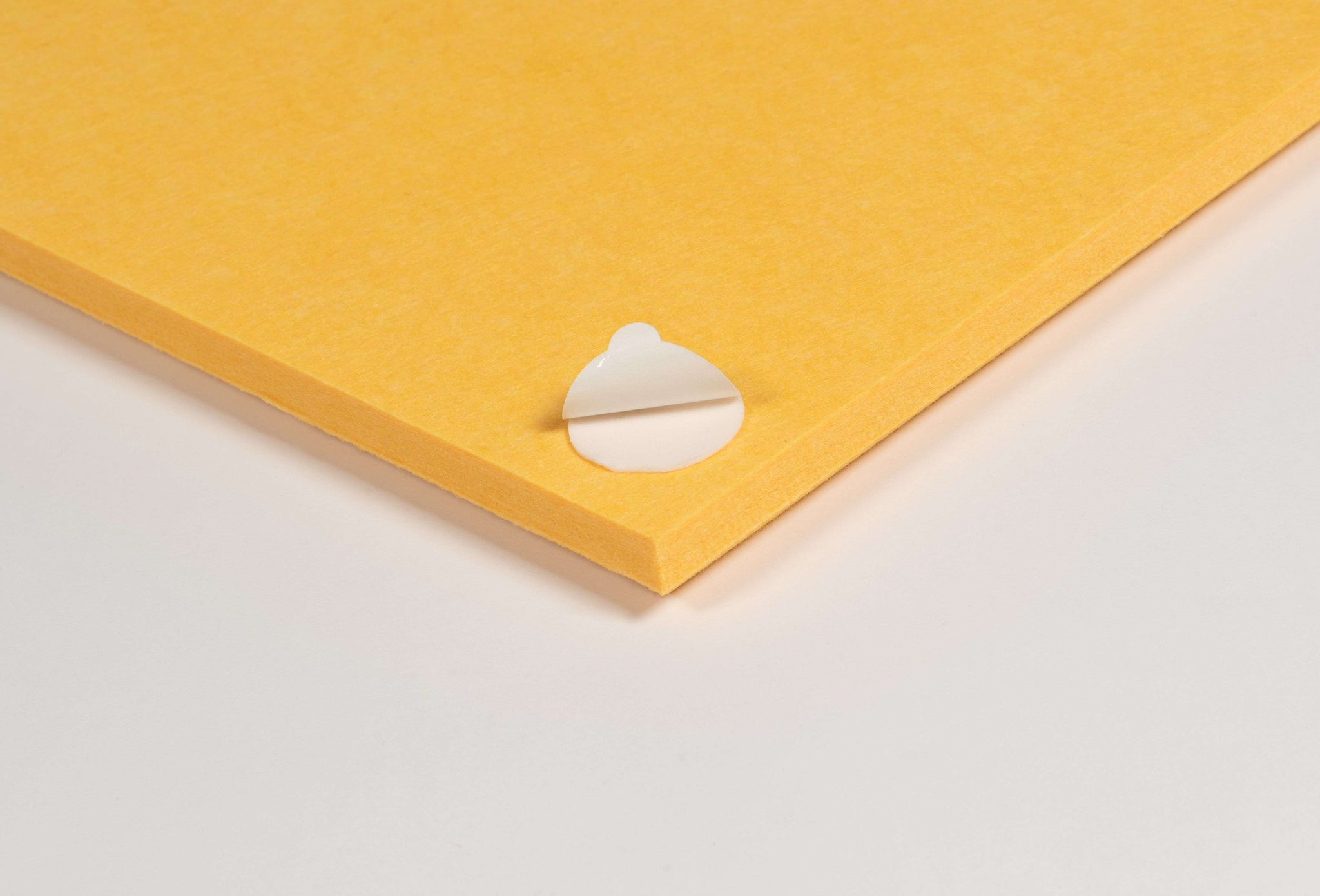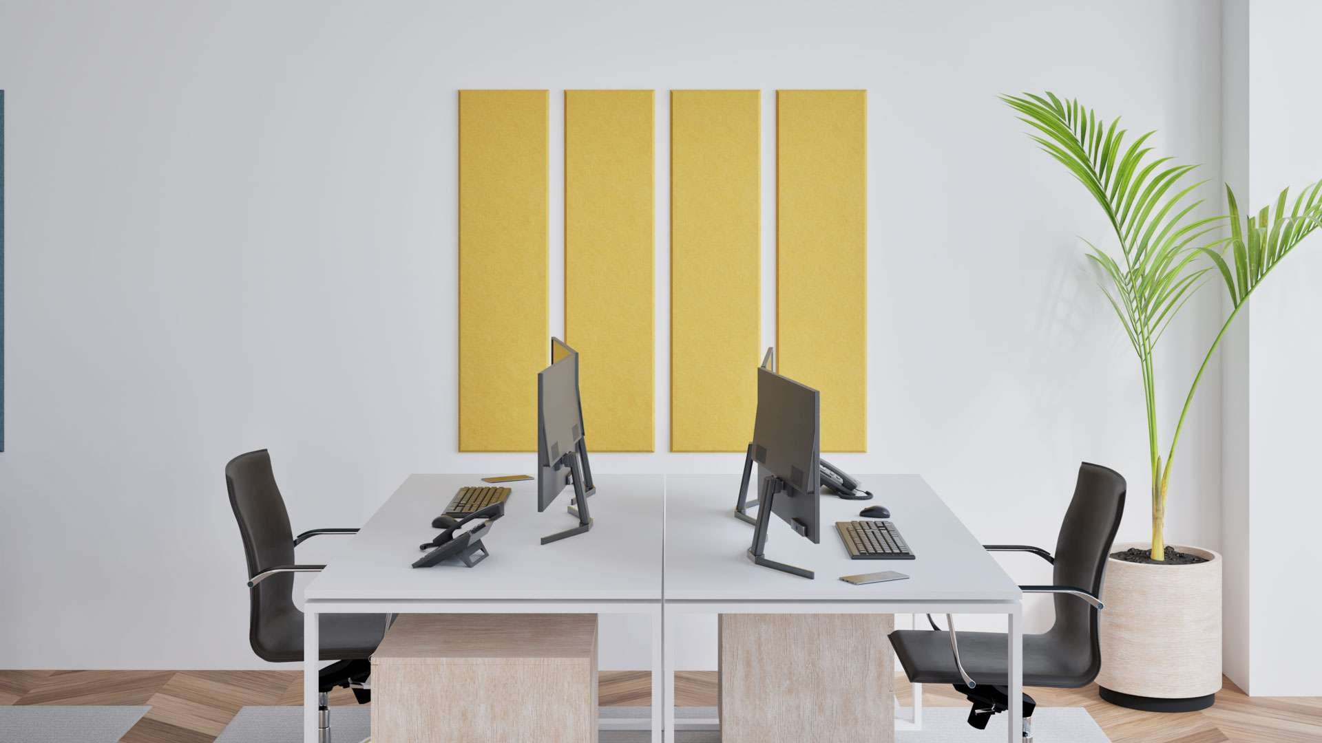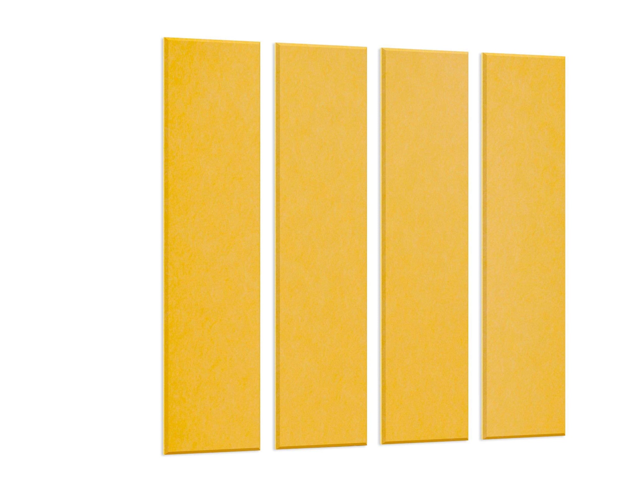 Akoestische wandbekleding bestaande uit 4 geel vilten stroken van 30x120 cm. Het materiaal is gemaakt van gerecyclede PET-flessen en absorbeert hinderlijke nagalm en schelle geluiden. Naar wens te bevestigen met bijgeleverde afstandhouder of strak tegen elkaar.