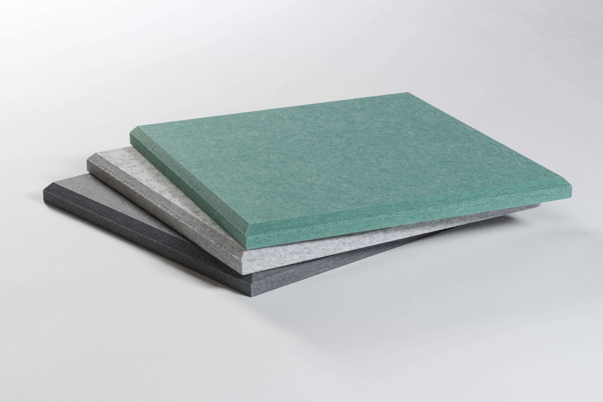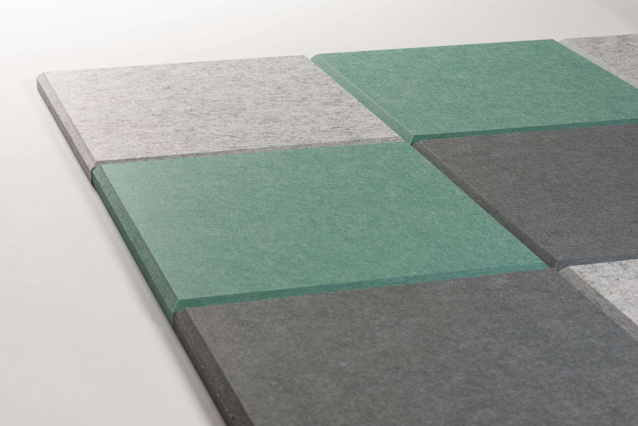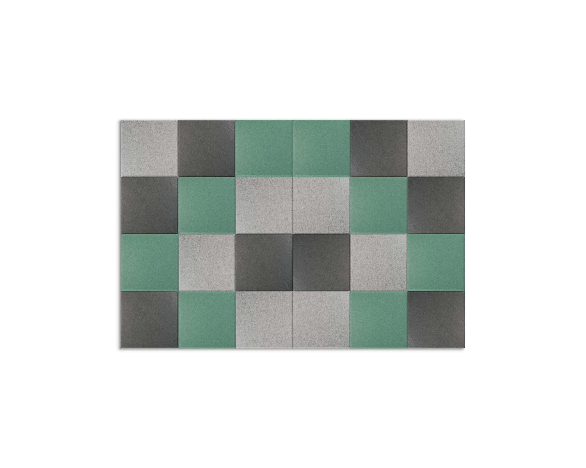 Akoestische wandbekleding bestaande uit 24 vilten tegels van 30x30 cm. Het materiaal is gemaakt van gerecyclede PET-flessen en absorbeert hinderlijke nagalm en schelle geluiden. Deze set bestaat uit 6 'petrol' groene tegels, 6 lichtgrijze tegels en 6 donkergrijze tegels. Creëer diverse patronen met één of meerdere sets.