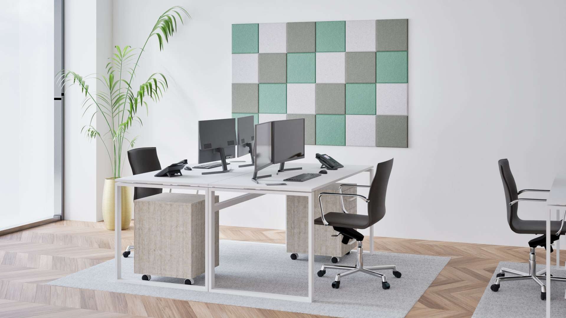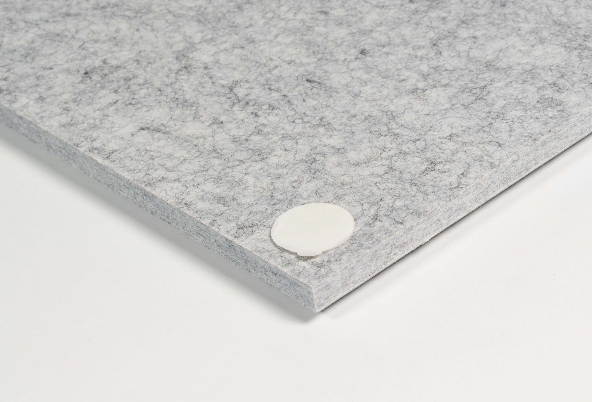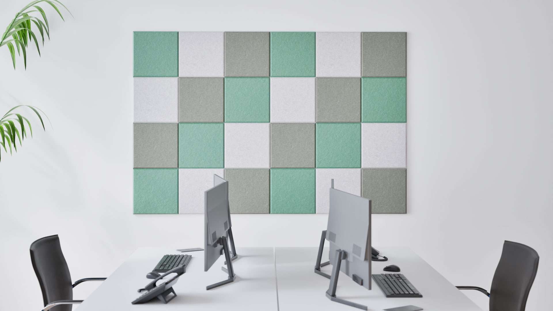 Akoestische wandbekleding bestaande uit 24 vilten tegels van 30x30 cm. Het materiaal is gemaakt van gerecyclede PET-flessen en absorbeert hinderlijke nagalm en schelle geluiden. Deze set bestaat uit 6 'petrol' groene tegels, 6 lichtgrijze tegels en 6 donkergrijze tegels. Creëer diverse patronen met één of meerdere sets.