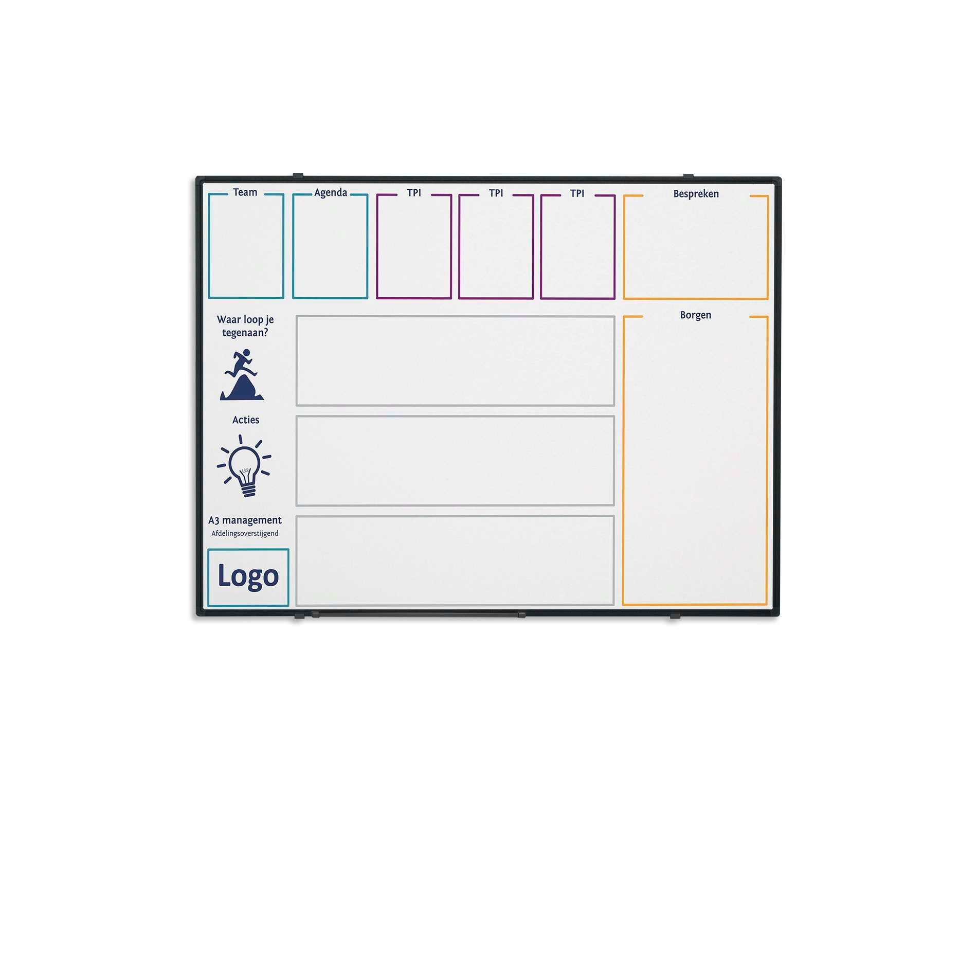 Whitebord met uw eigen full colour bedrukking. Ideaal voor bijvoorbeeld een enkel uniek visual management bord per team of een reeks gepersonaliseerde whiteboards met een bedrijfsontwerp. De borden zijn magneethoudend en droog uitwisbaar. De drukinkt zit in het bord ingebakken en is bestendig tegen krassen. De inkt wordt beschermd tegen zonlicht, zodat de kleuren echt blijven.