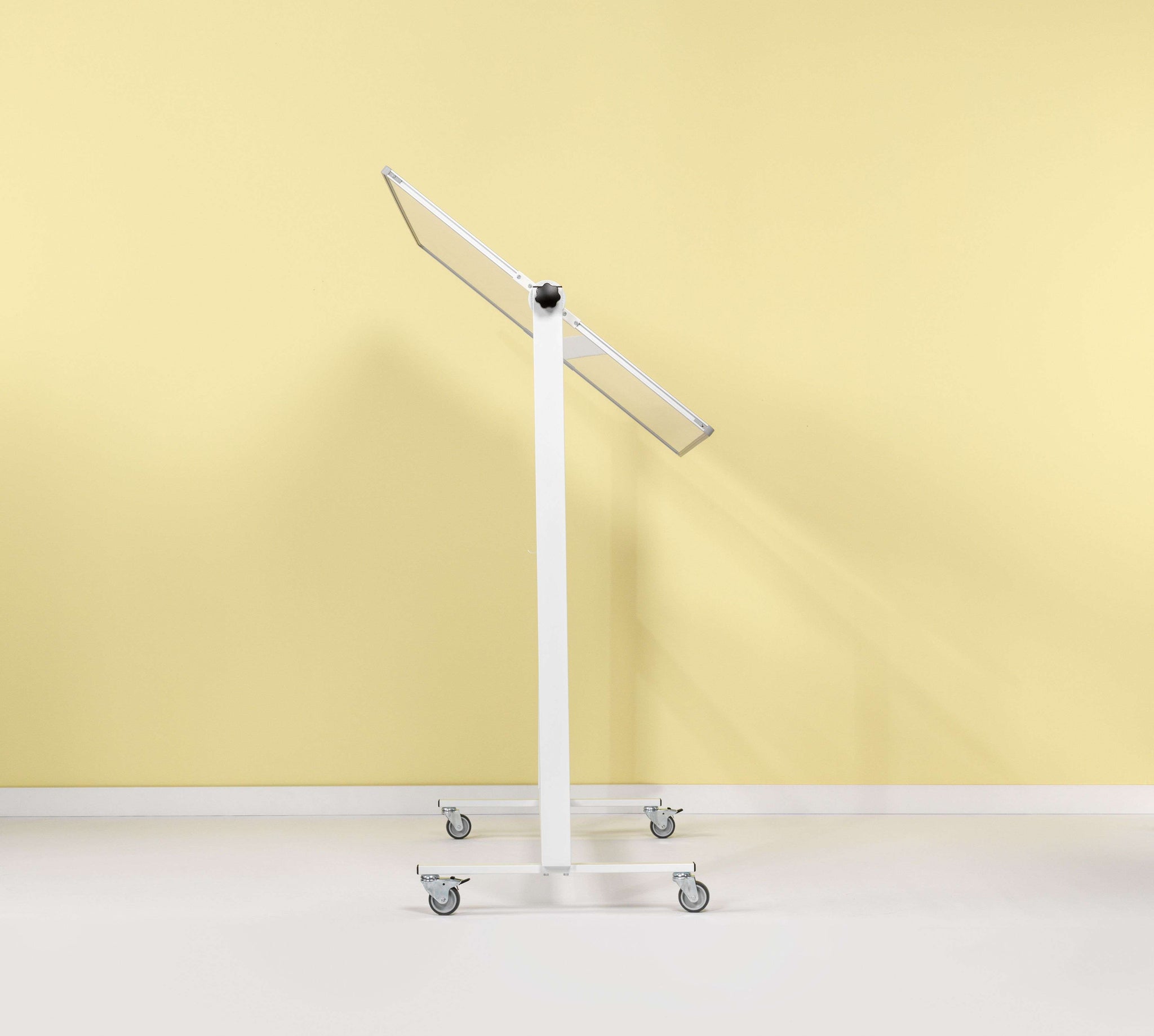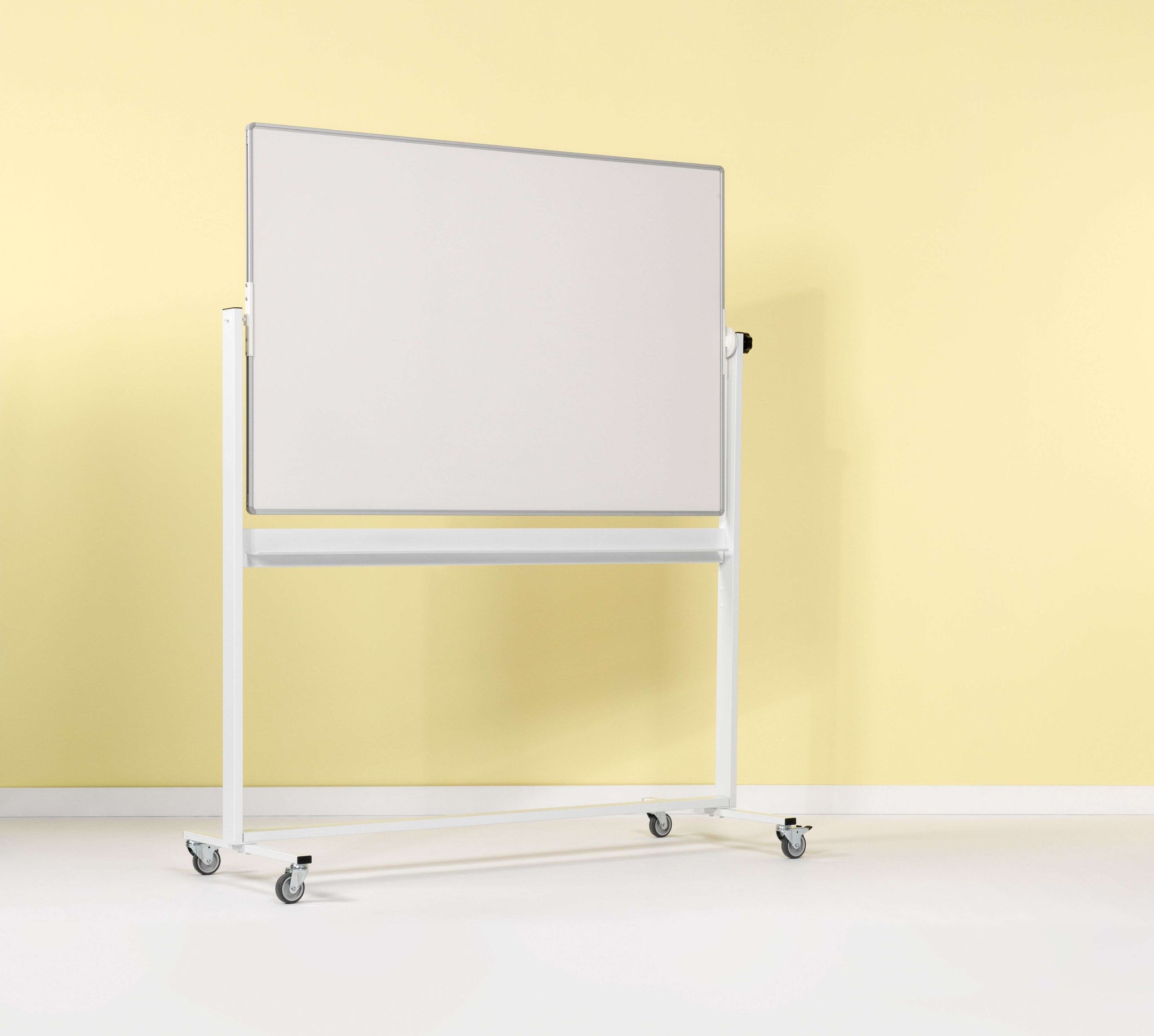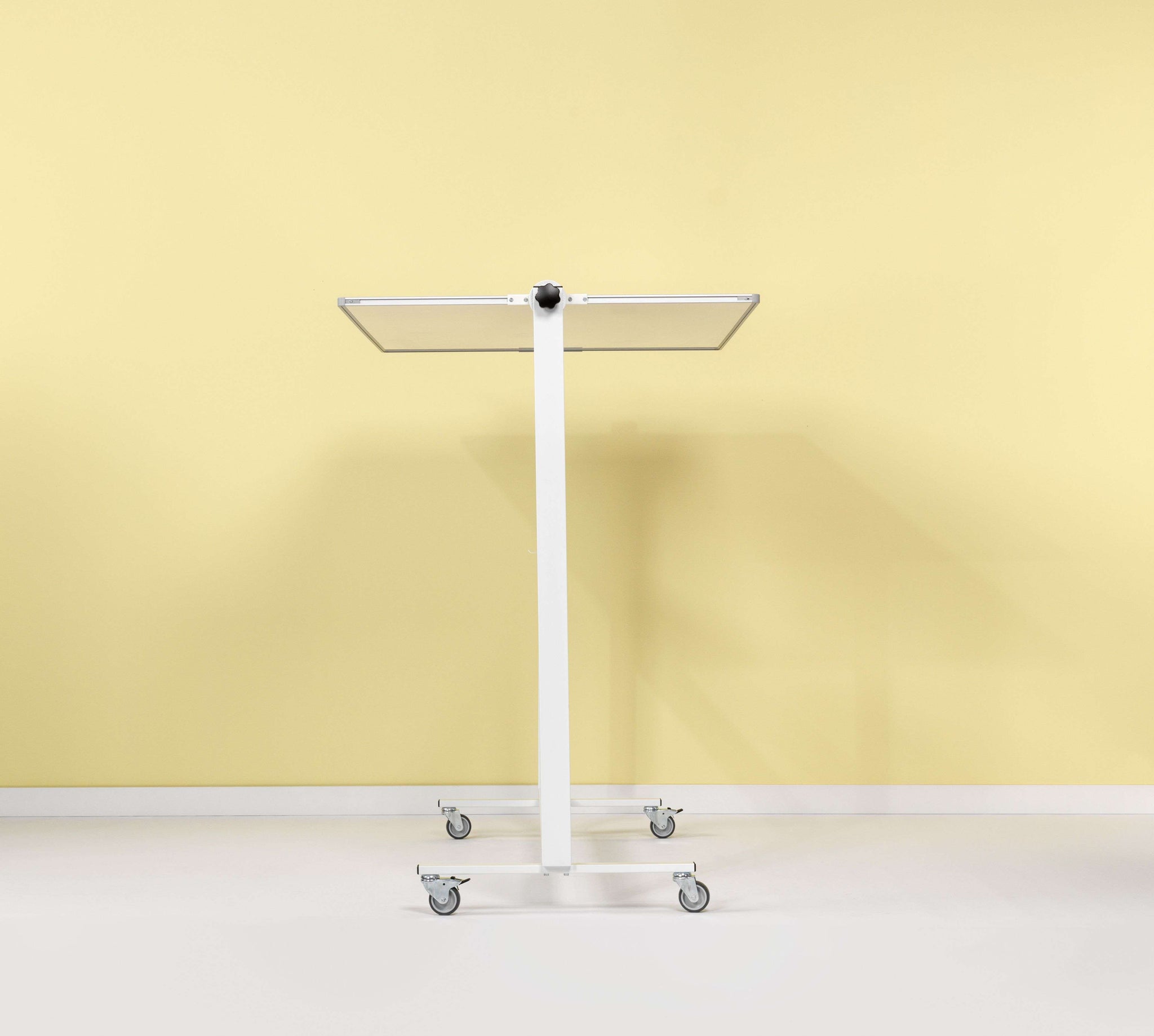 Dubbelzijdig beschrijfbaar whitebord van wit emailstaal, met aluminium RC-profiel. Middels de draaiknop is het bord 360° te draaien en in iedere hoek te fixeren. De robuuste witte stalen stelling is voorzien van lange afleggoot en 4 industriële wielen (2 met rem), daardoor geschikt voor regelmatig of intensief verplaatsen over oneven vloeren.